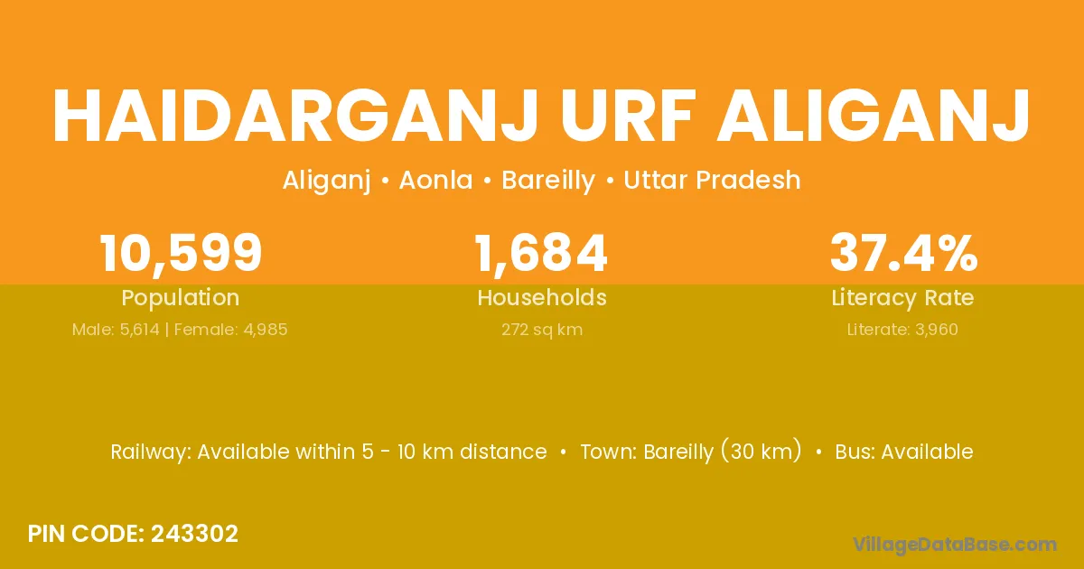 Bareilly (30 km) is the nearest town to Haidarganj Urf Aliganj village for major economic activities and is located approximately 30 km away.