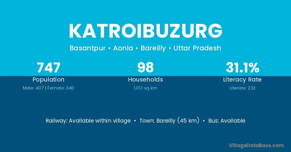 Bareilly (45 km) is the nearest town to Katroibuzurg village for major economic activities and is located approximately 45 km away.