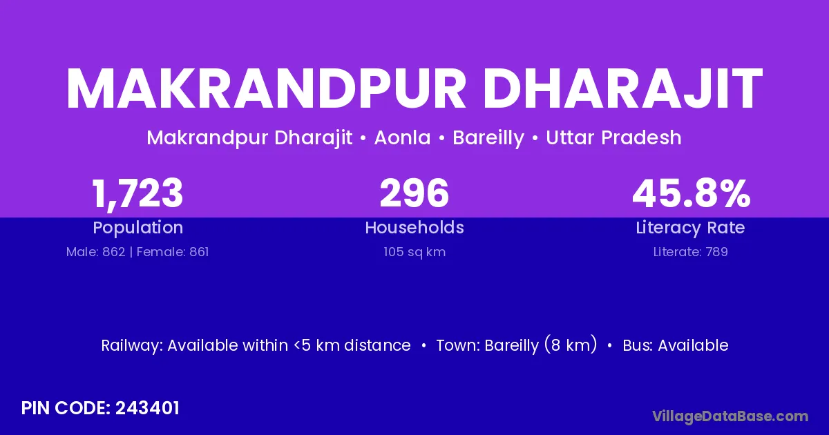 Bareilly (8 km) is the nearest town to Makrandpur Dharajit village for major economic activities and is located approximately 8 km away.