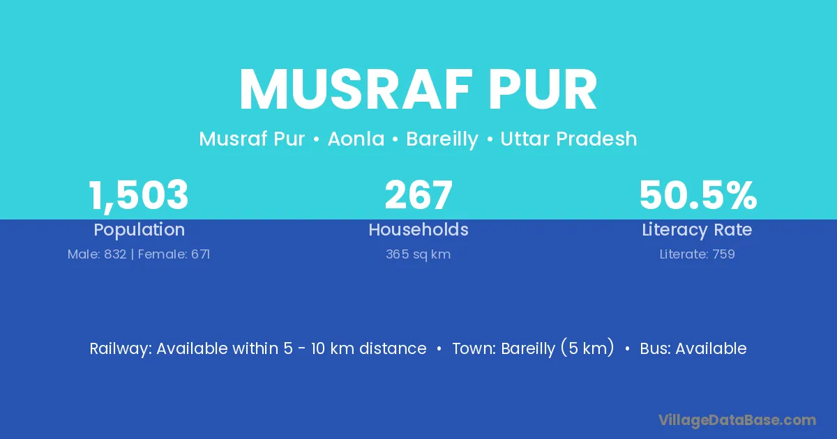 Bareilly (5 km) is the nearest town to Musraf Pur village for major economic activities and is located approximately 5 km away.