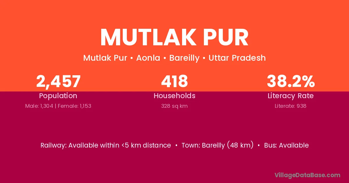 Bareilly (48 km) is the nearest town to Mutlak Pur village for major economic activities and is located approximately 48 km away.