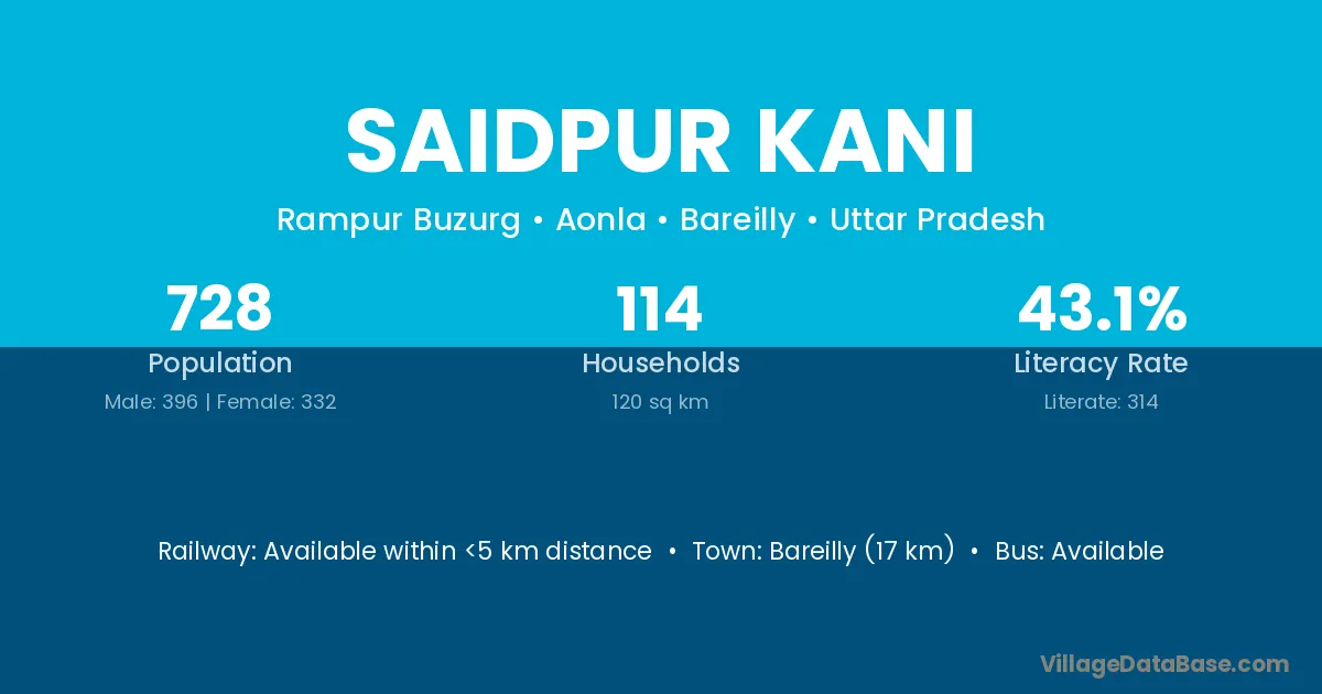 Bareilly (17 km) is the nearest town to Saidpur Kani village for major economic activities and is located approximately 17 km away.