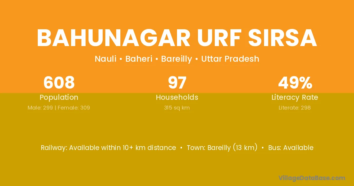 Bahunagar Urf Sirsa village has a total population of 608 people, of which 299 are males and 309 are females.