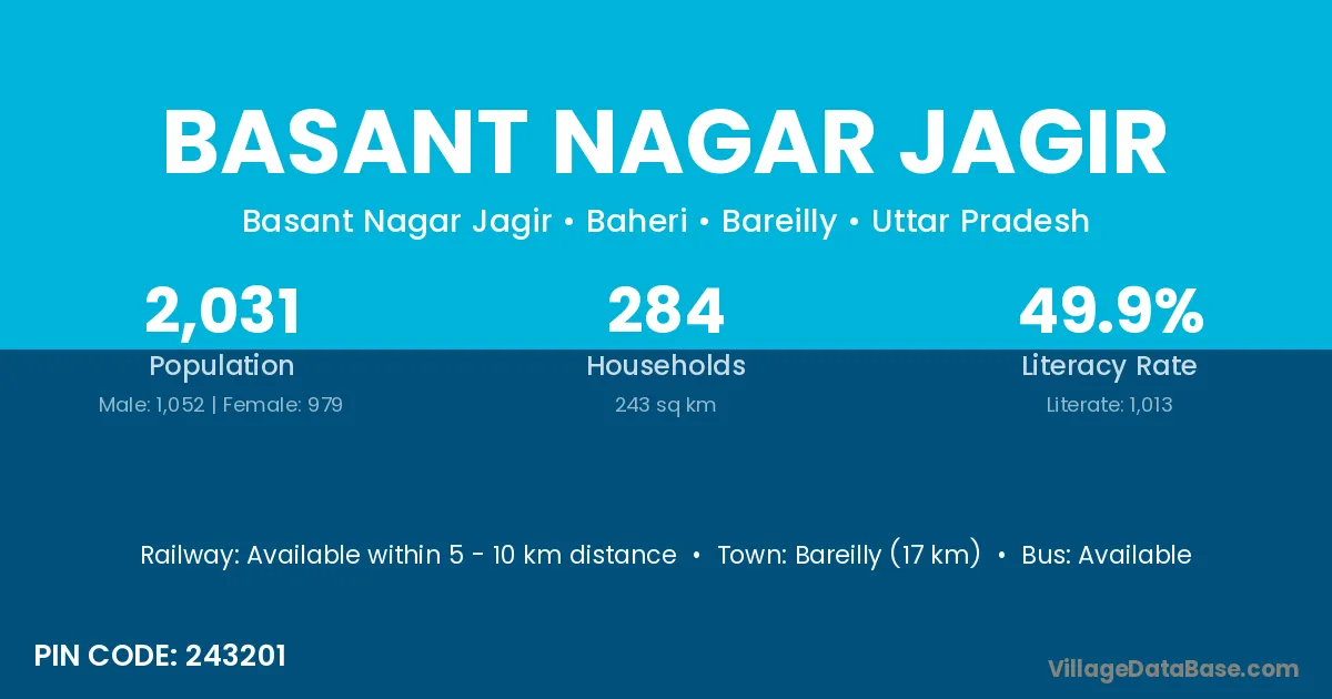 Bareilly (17 km) is the nearest town to Basant Nagar Jagir village for major economic activities and is located approximately 17 km away.