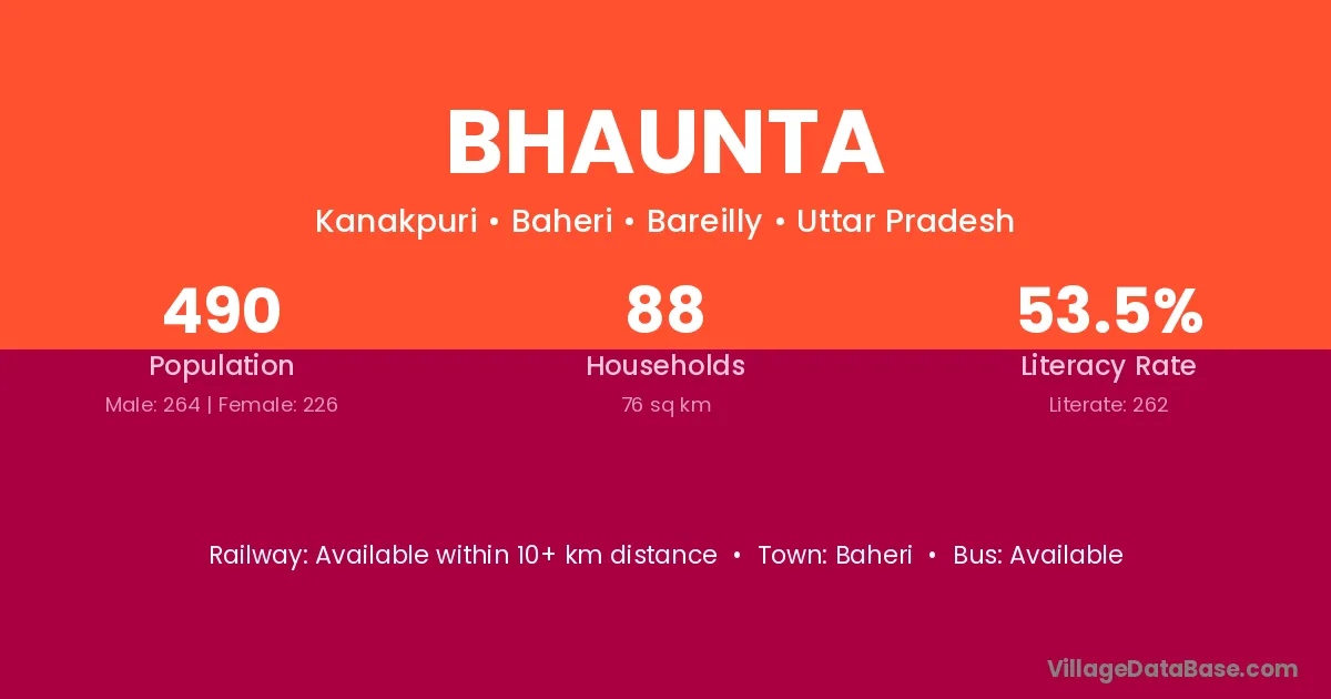 Bhaunta village has a total population of 490 people, of which 264 are males and 226 are females.