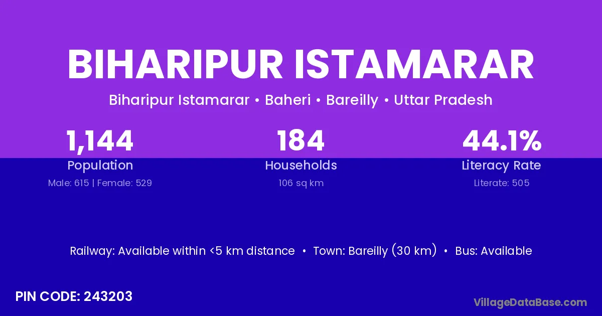 Bareilly (30 km) is the nearest town to Biharipur Istamarar village for major economic activities and is located approximately 30 km away.
