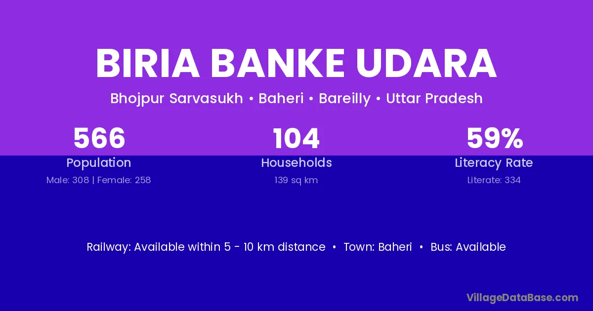 Biria Banke Udara village has a total population of 566 people, of which 308 are males and 258 are females.