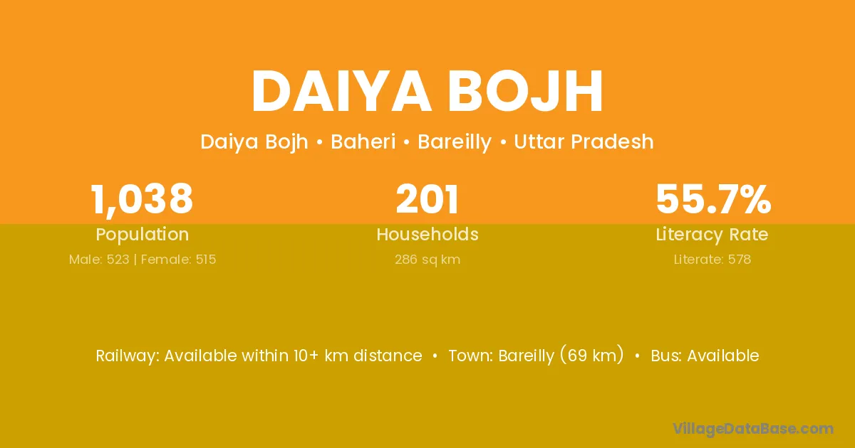 Daiya Bojh village has a total population of 1,038 people, of which 523 are males and 515 are females.