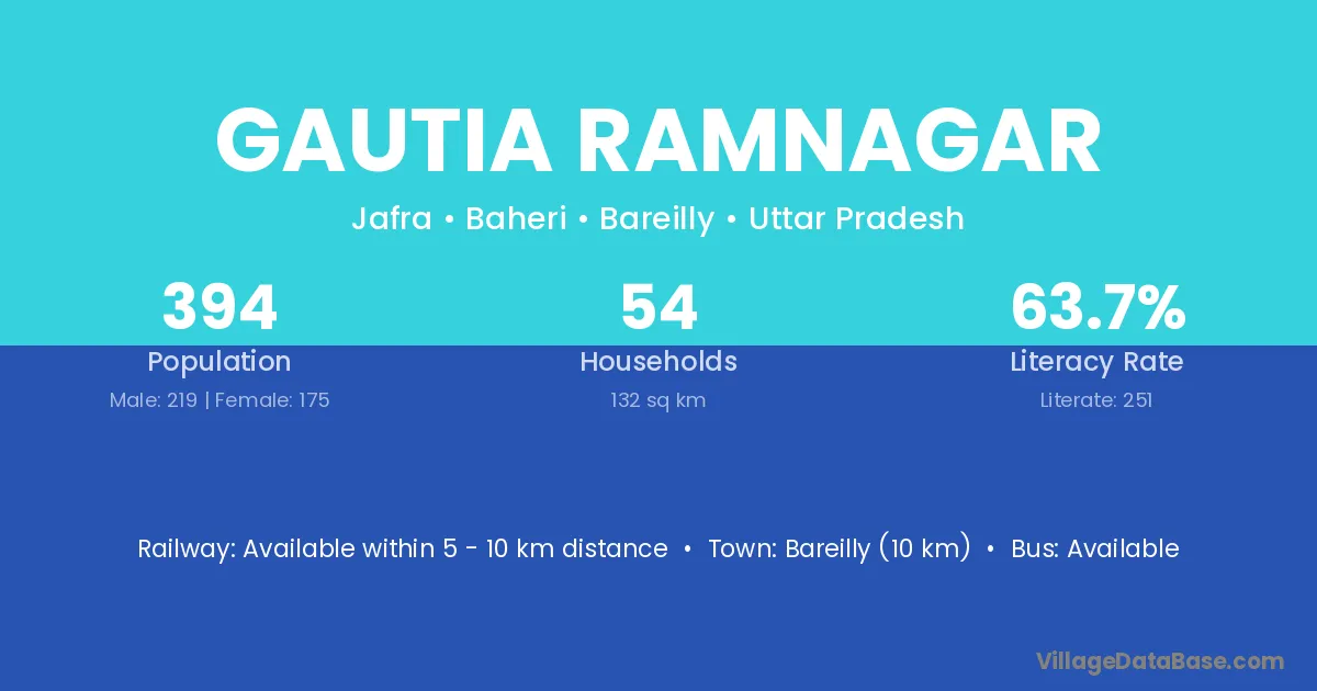 Bareilly (10 km) is the nearest town to Gautia Ramnagar village for major economic activities and is located approximately 10 km away.