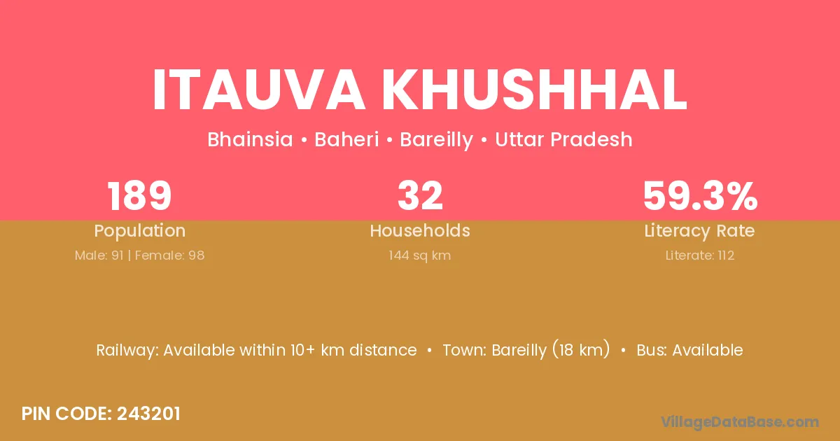 Bareilly (18 km) is the nearest town to Itauva Khushhal village for major economic activities and is located approximately 18 km away.