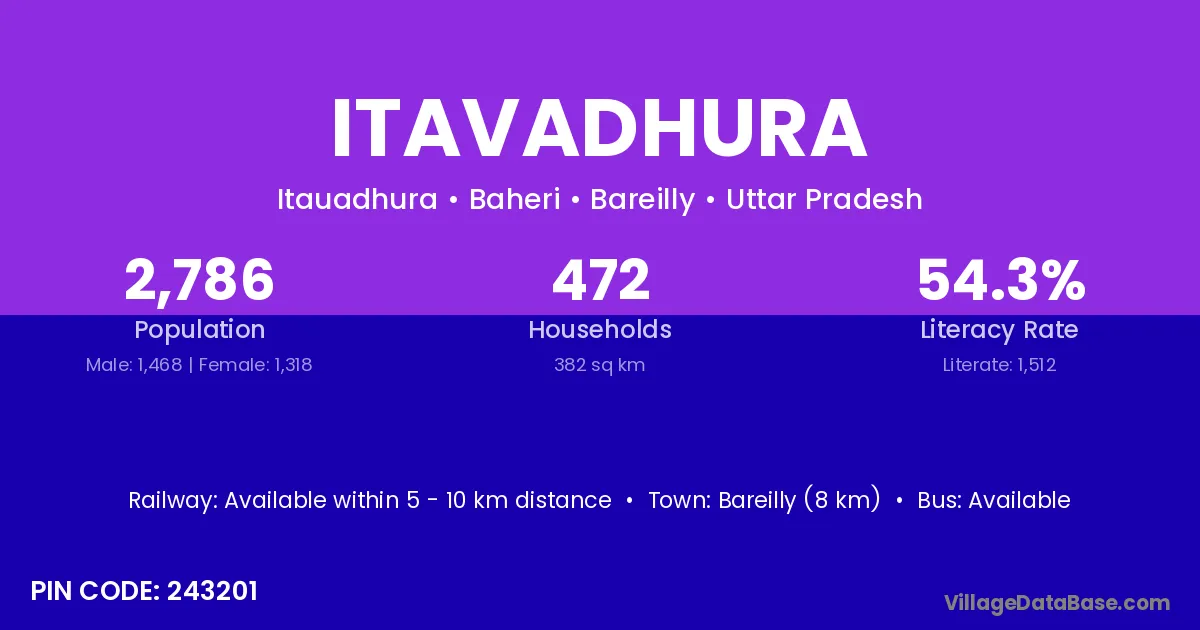 Bareilly (8 km) is the nearest town to Itavadhura village for major economic activities and is located approximately 8 km away.