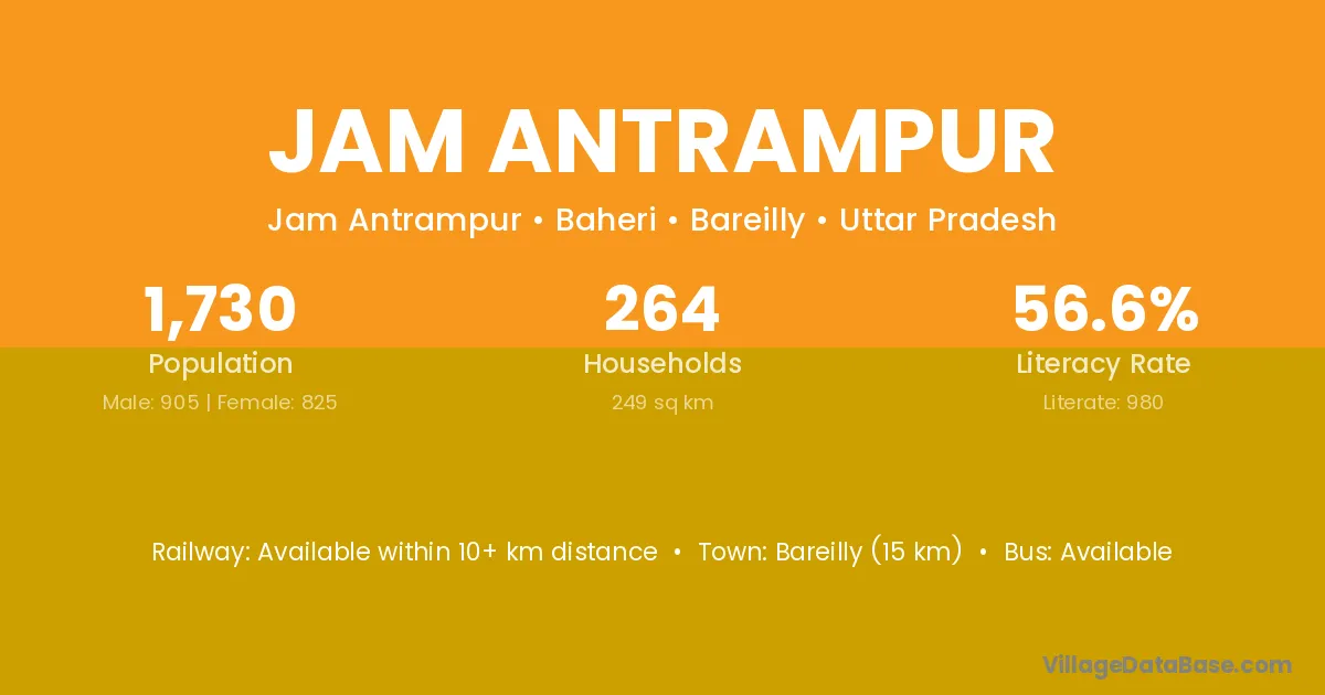 Bareilly (15 km) is the nearest town to Jam Antrampur village for major economic activities and is located approximately 15 km away.