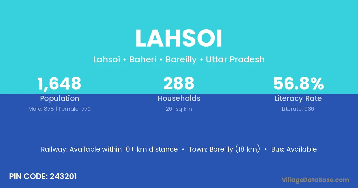 Bareilly (18 km) is the nearest town to Lahsoi village for major economic activities and is located approximately 18 km away.