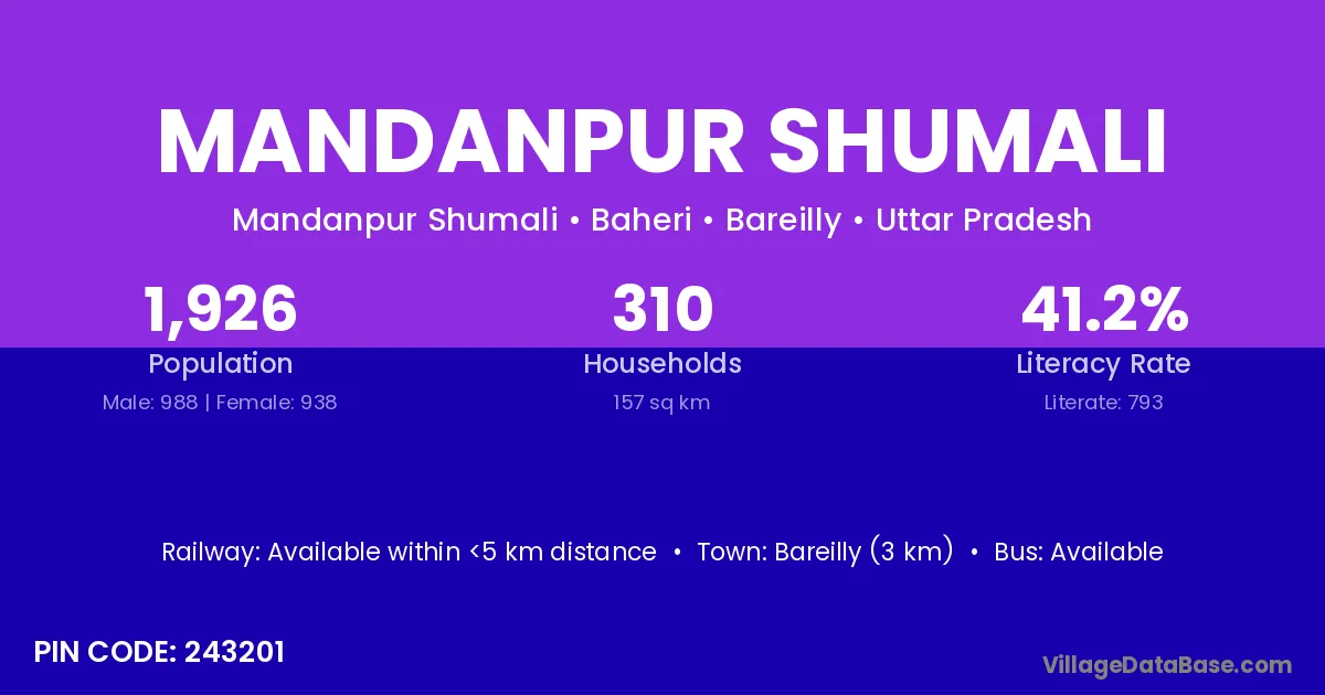 Bareilly (3 km) is the nearest town to Mandanpur Shumali village for major economic activities and is located approximately 3 km away.