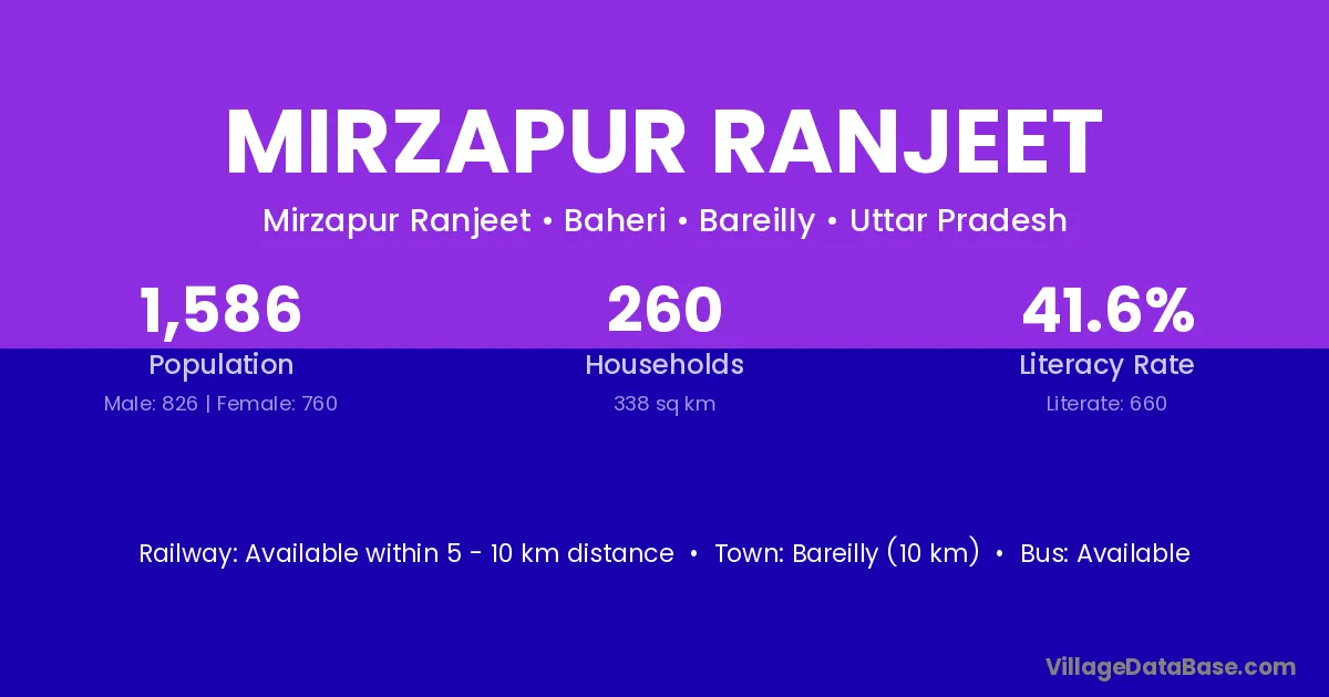 Mirzapur Ranjeet village has a total population of 1,586 people, of which 826 are males and 760 are females.