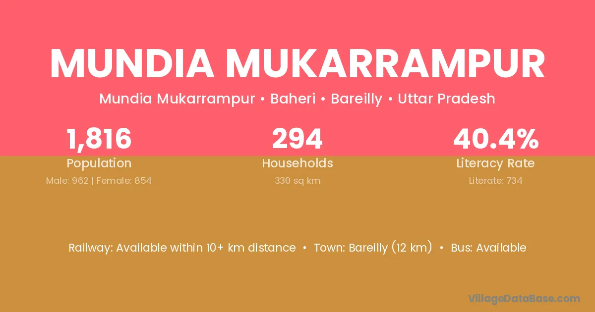Mundia Mukarrampur village has a total population of 1,816 people, of which 962 are males and 854 are females.