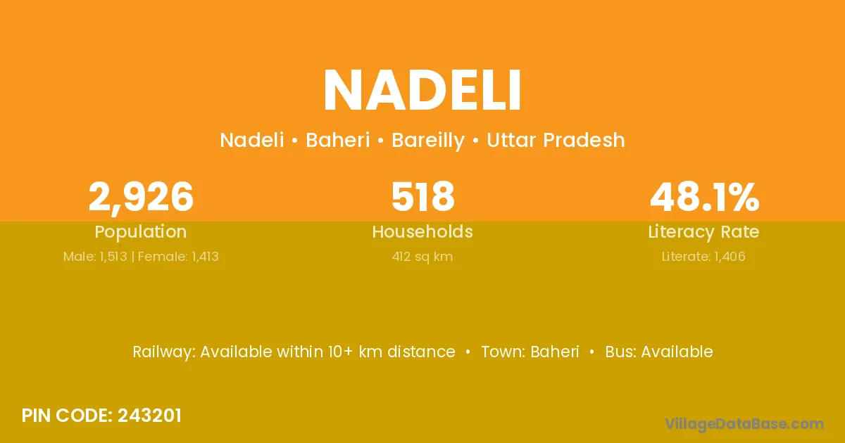 Nadeli village has a total population of 2,926 people, of which 1,513 are males and 1,413 are females.
