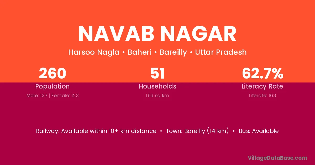 Bareilly (14 km) is the nearest town to Navab Nagar village for major economic activities and is located approximately 14 km away.