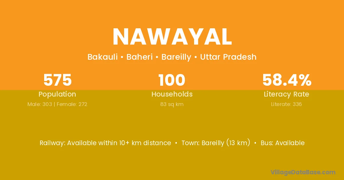 Bareilly (13 km) is the nearest town to Nawayal village for major economic activities and is located approximately 13 km away.