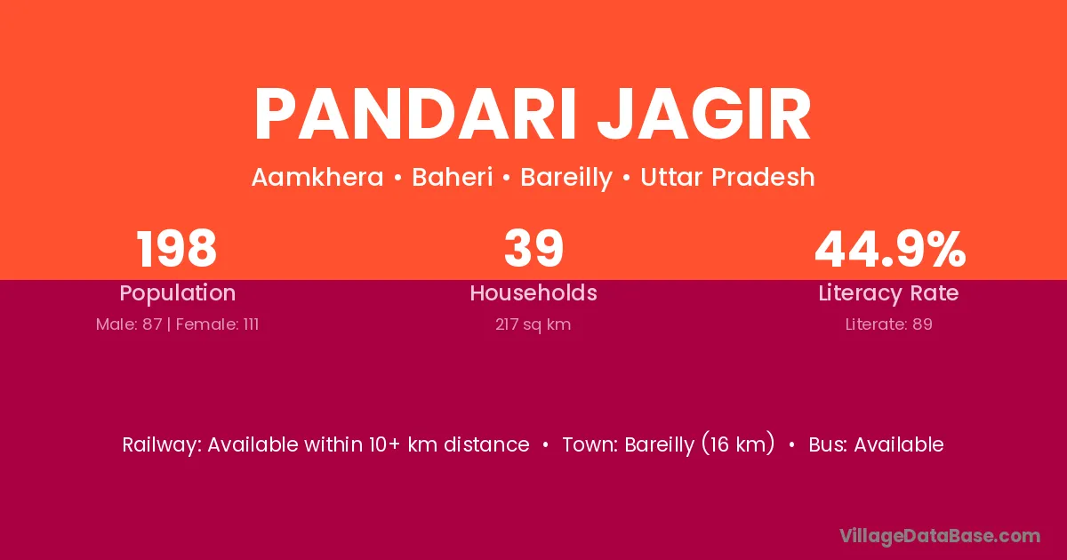 Bareilly (16 km) is the nearest town to Pandari Jagir village for major economic activities and is located approximately 16 km away.
