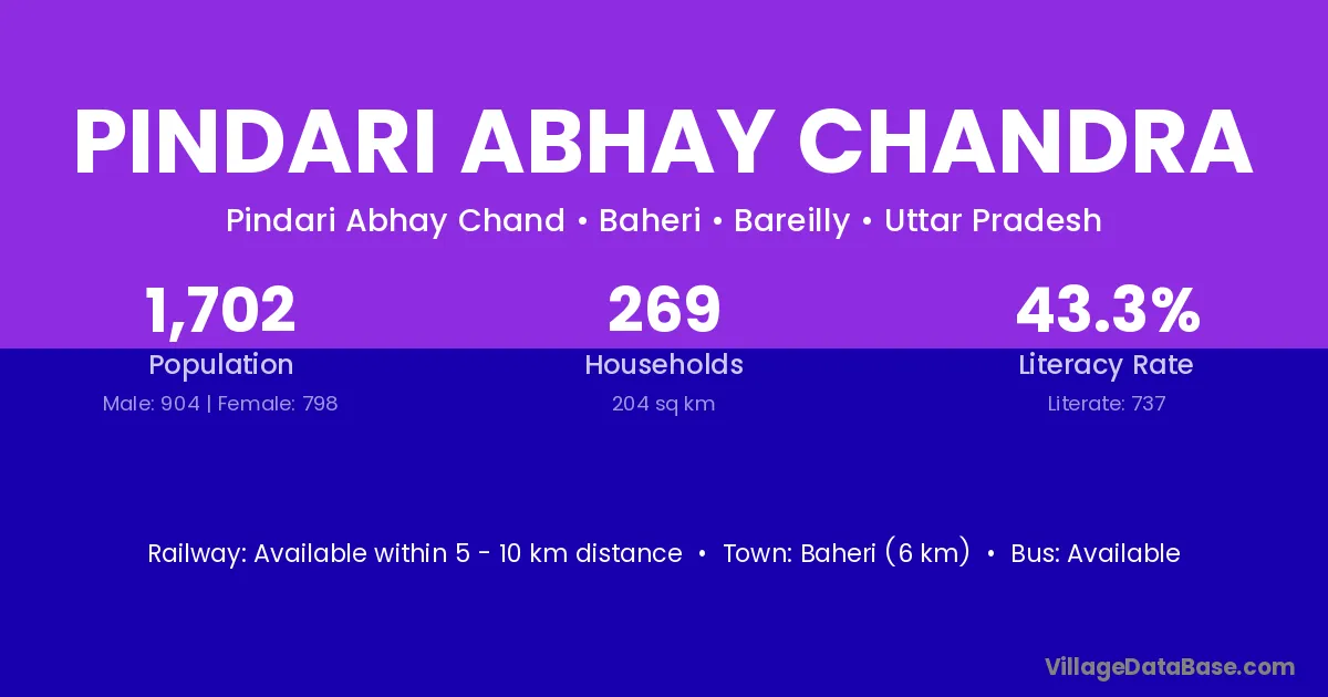 Pindari Abhay Chandra village has a total population of 1,702 people, of which 904 are males and 798 are females.