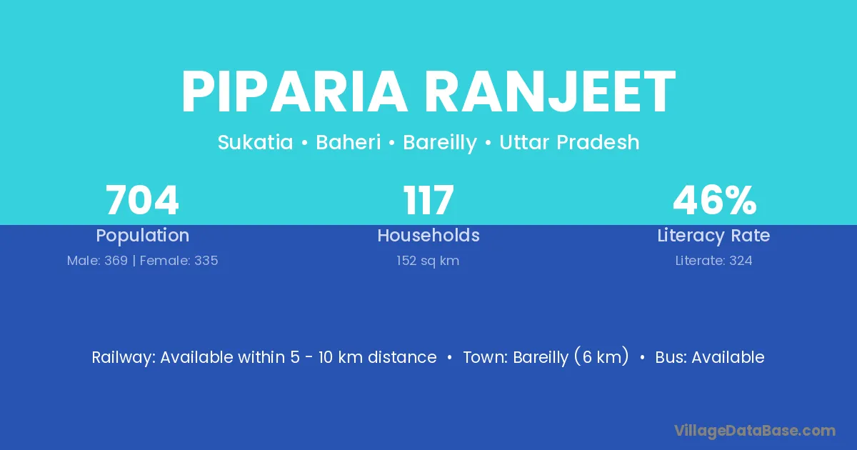 Bareilly (6 km) is the nearest town to Piparia Ranjeet village for major economic activities and is located approximately 6 km away.