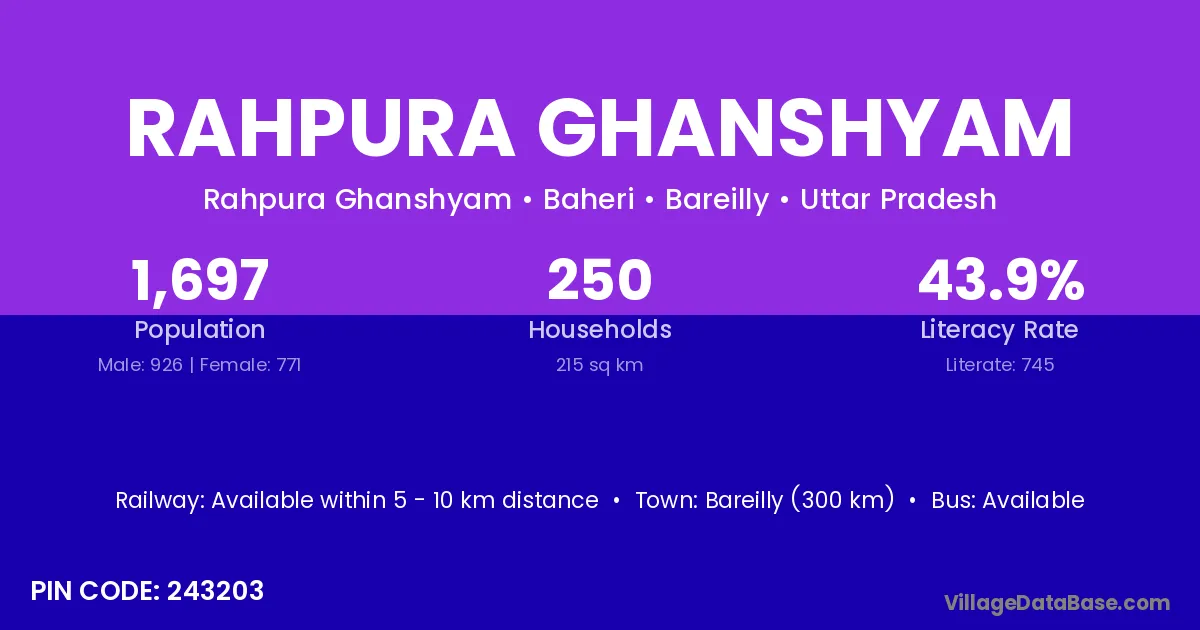 Bareilly (300 km) is the nearest town to Rahpura Ghanshyam village for major economic activities and is located approximately 300 km away.