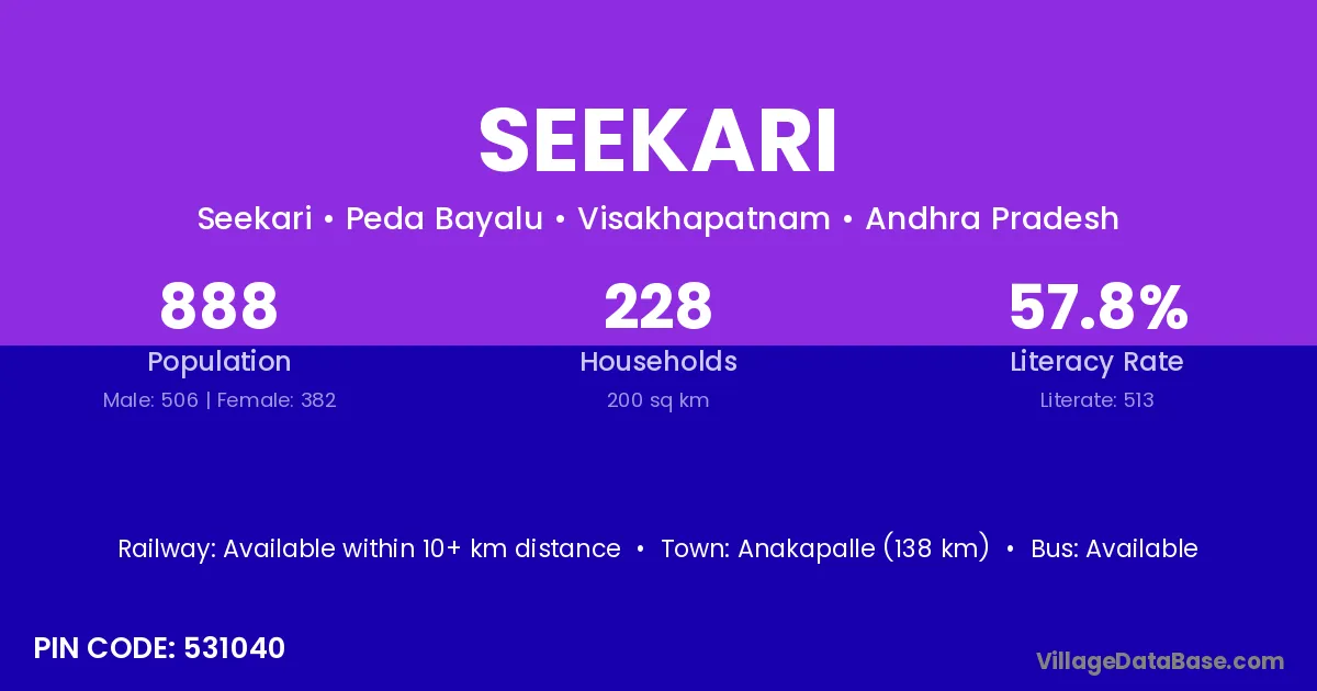 The literacy rate of Seekari village is 51.15%. Male literacy stands at 58.37% and female literacy at 43.22%.