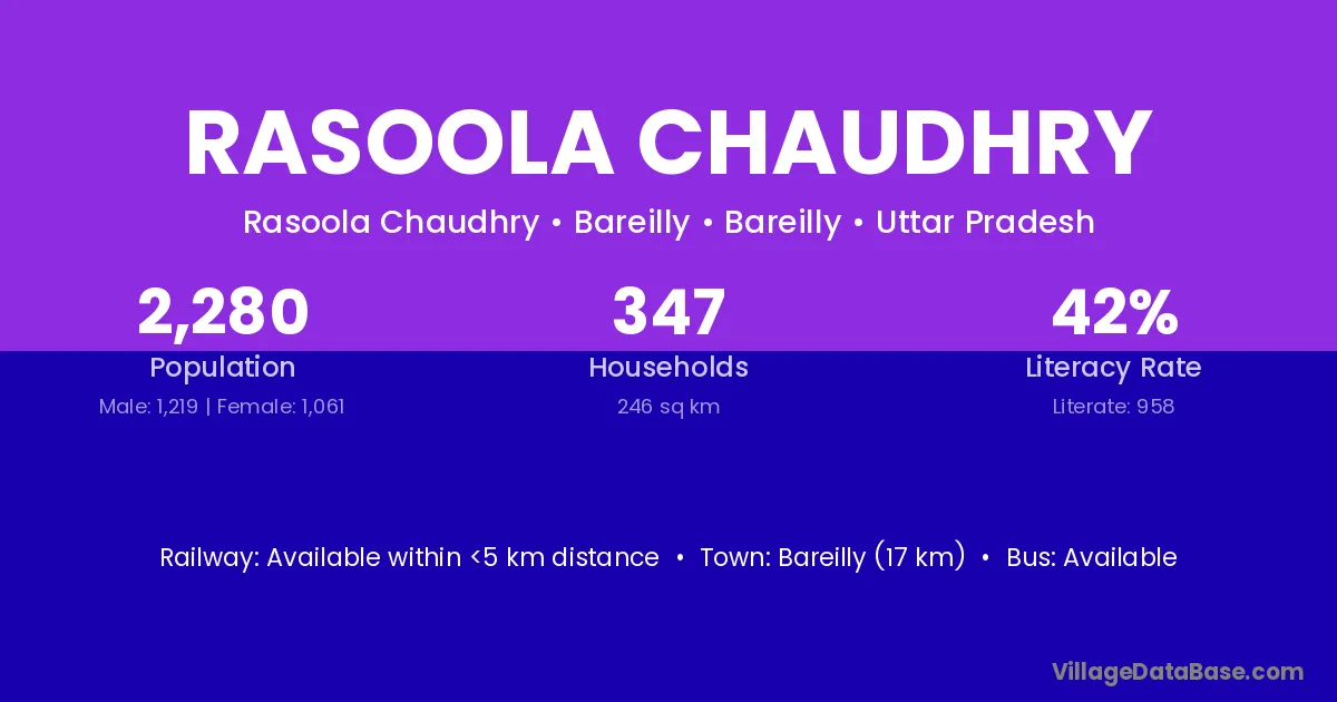 Bareilly (17 km) is the nearest town to Rasoola Chaudhry village for major economic activities and is located approximately 17 km away.