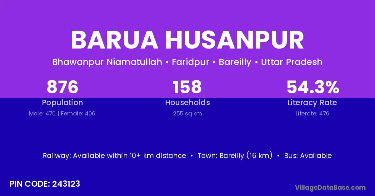 Bareilly (16 km) is the nearest town to Barua Husanpur village for major economic activities and is located approximately 16 km away.