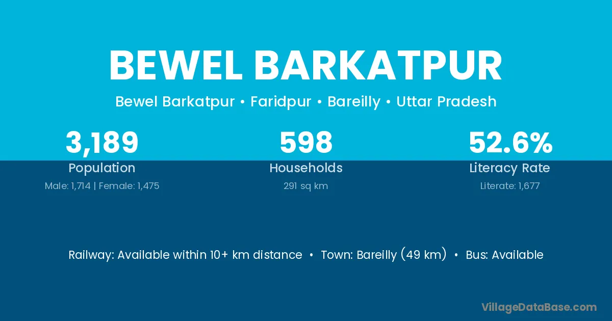 Bareilly (49 km) is the nearest town to Bewel Barkatpur village for major economic activities and is located approximately 49 km away.