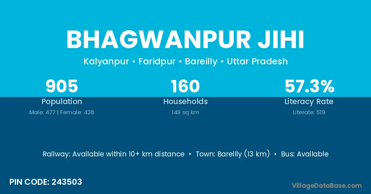 Bareilly (13 km) is the nearest town to Bhagwanpur Jihi village for major economic activities and is located approximately 13 km away.