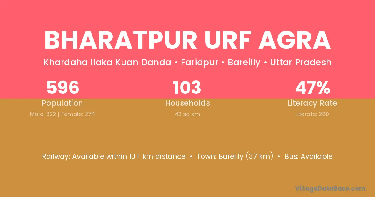 Bareilly (37 km) is the nearest town to Bharatpur Urf Agra village for major economic activities and is located approximately 37 km away.