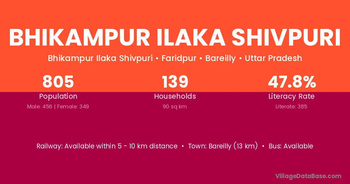 Bareilly (13 km) is the nearest town to Bhikampur Ilaka Shivpuri village for major economic activities and is located approximately 13 km away.