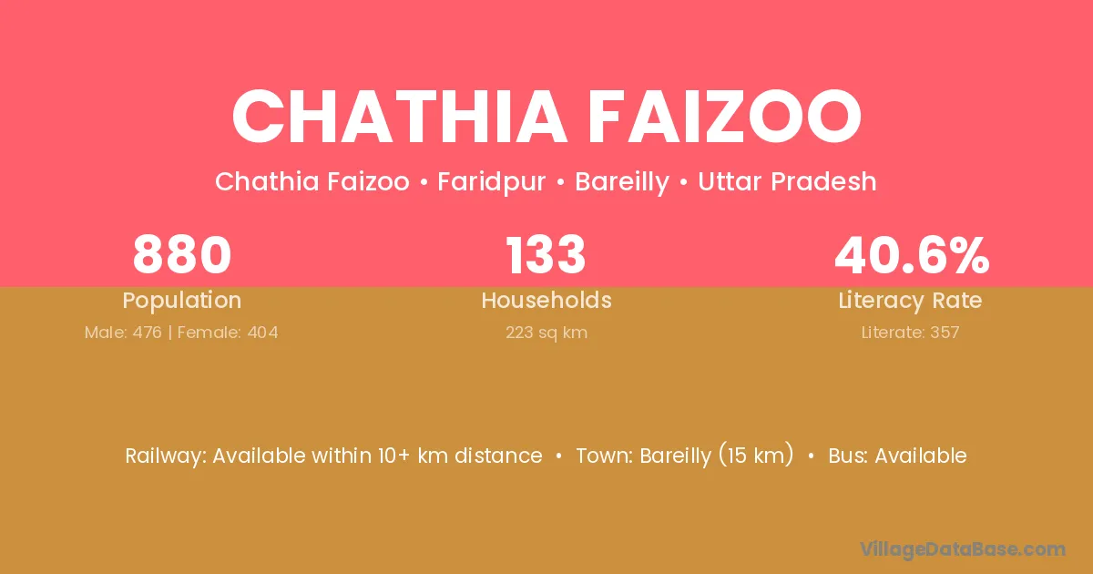 Bareilly (15 km) is the nearest town to Chathia Faizoo village for major economic activities and is located approximately 15 km away.