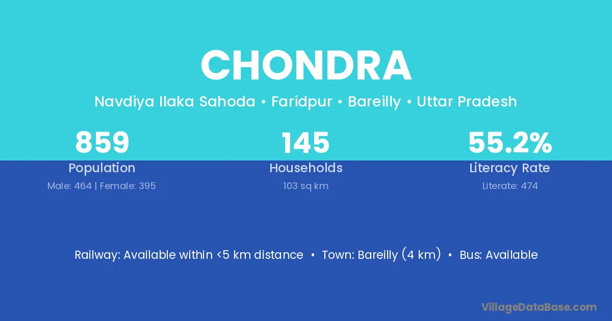 Bareilly (4 km) is the nearest town to Chondra village for major economic activities and is located approximately 4 km away.