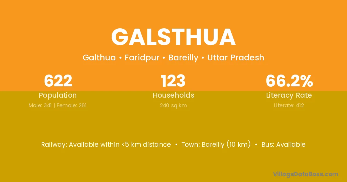 Bareilly (10 km) is the nearest town to Galsthua village for major economic activities and is located approximately 10 km away.
