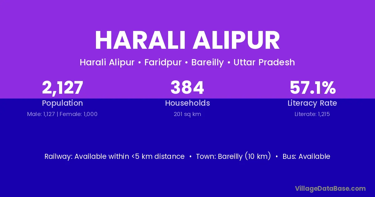 Bareilly (10 km) is the nearest town to Harali Alipur village for major economic activities and is located approximately 10 km away.