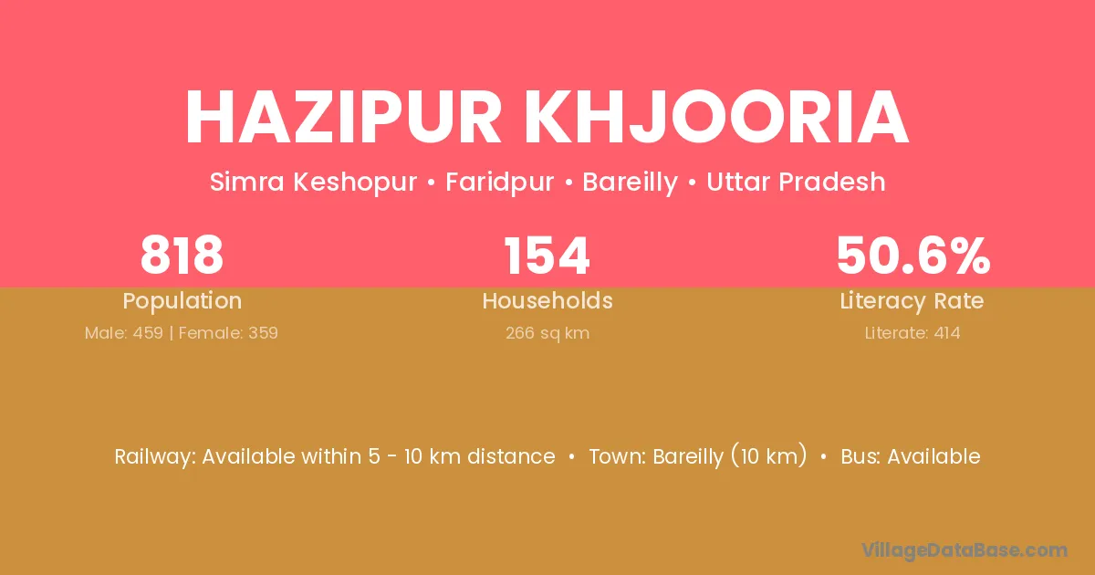 Bareilly (10 km) is the nearest town to Hazipur Khjooria village for major economic activities and is located approximately 10 km away.