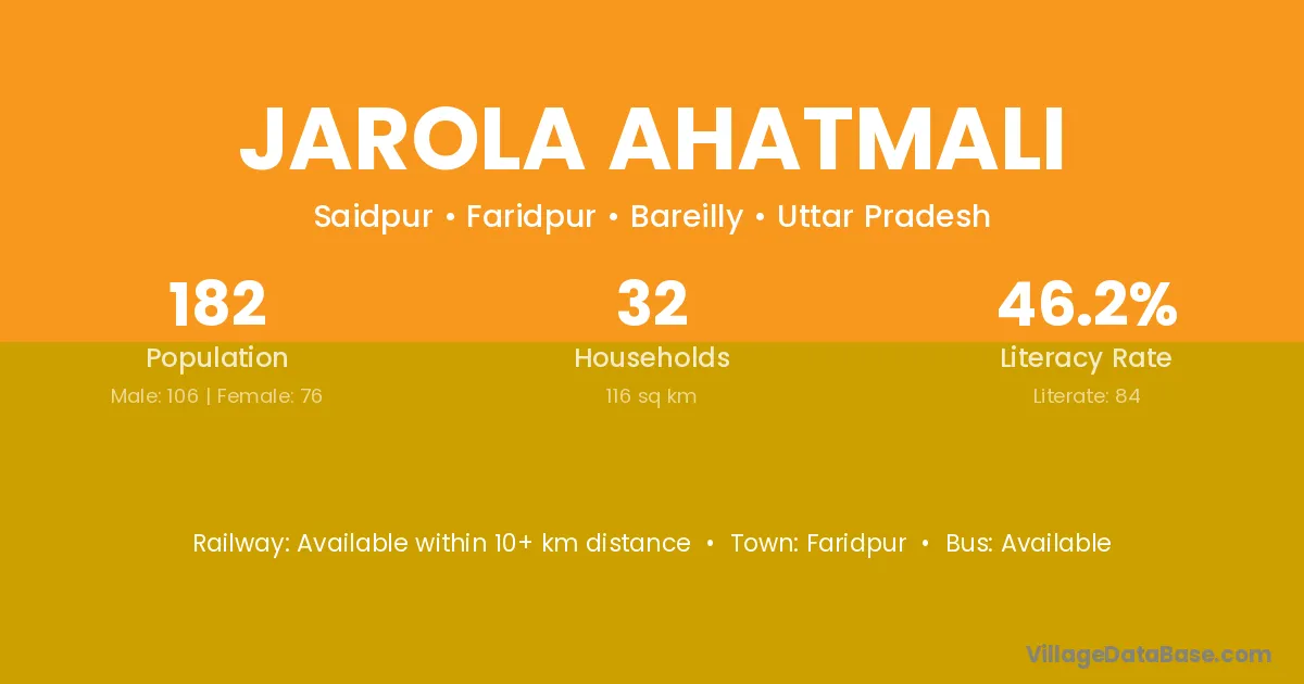 Jarola Ahatmali village has a total population of 182 people, of which 106 are males and 76 are females.