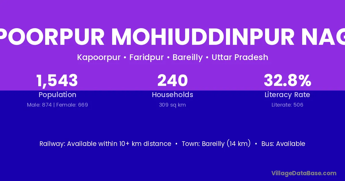 Bareilly (14 km) is the nearest town to Kapoorpur Mohiuddinpur Nagar village for major economic activities and is located approximately 14 km away.