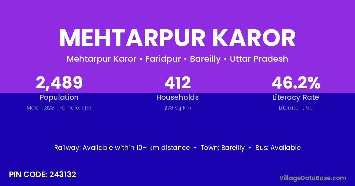 Bareilly is the nearest town to Mehtarpur Karor village for major economic activities