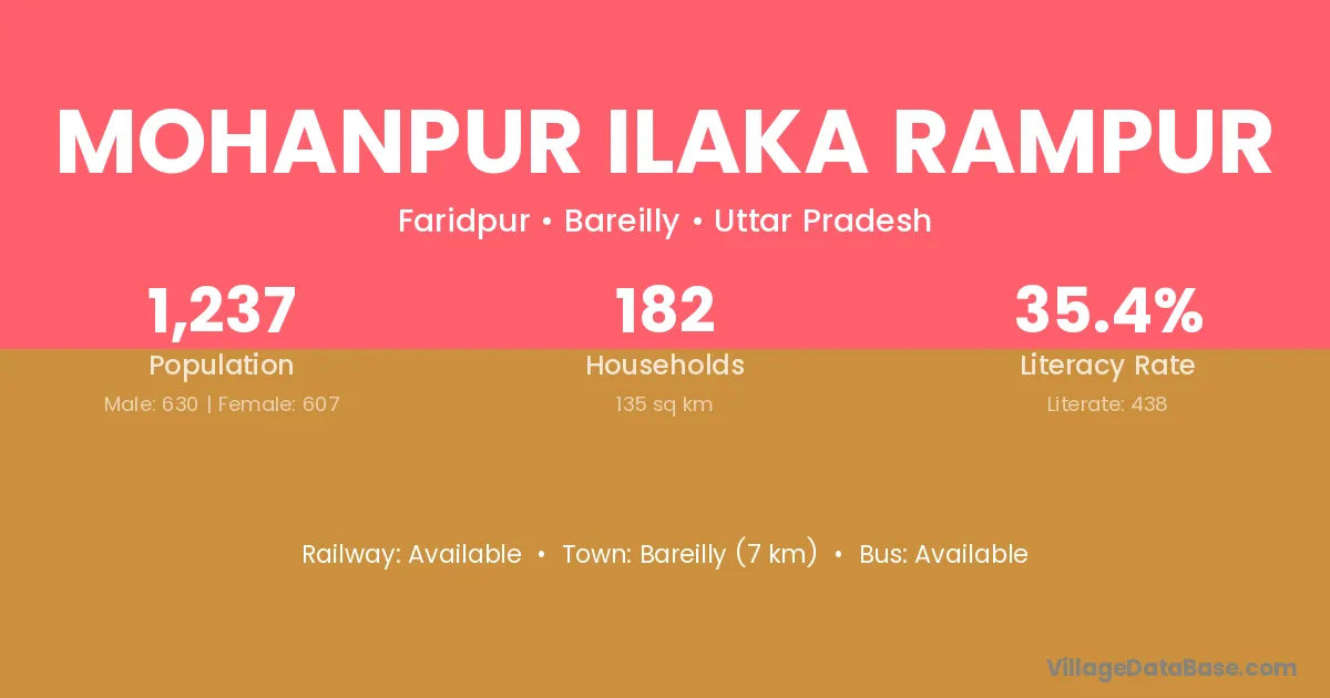 Mohanpur Ilaka Rampur village has a total population of 1,237 people, of which 630 are males and 607 are females.