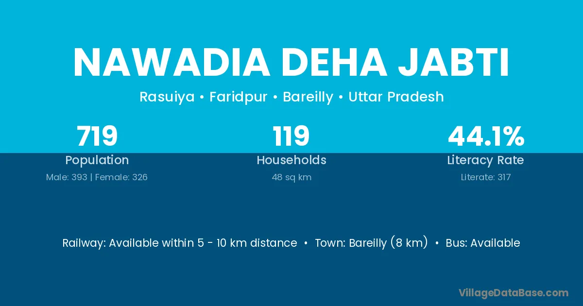 Bareilly (8 km) is the nearest town to Nawadia Deha Jabti village for major economic activities and is located approximately 8 km away.