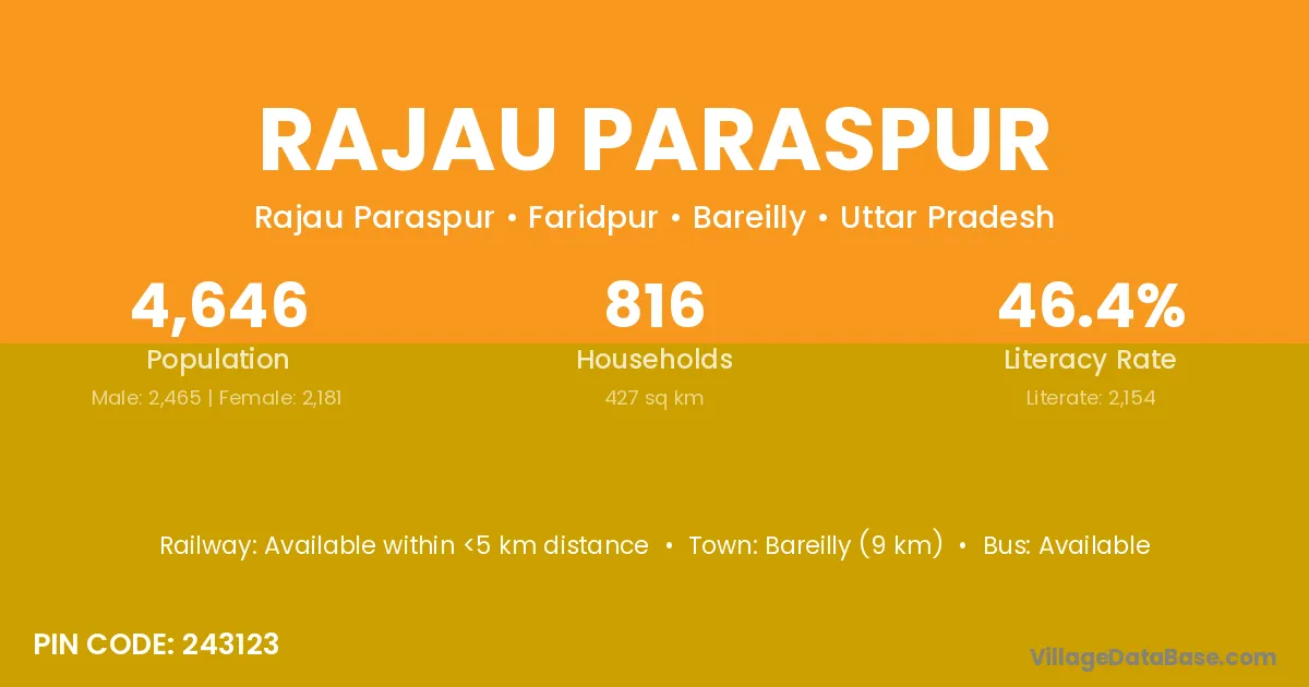 Bareilly (9 km) is the nearest town to Rajau Paraspur village for major economic activities and is located approximately 9 km away.
