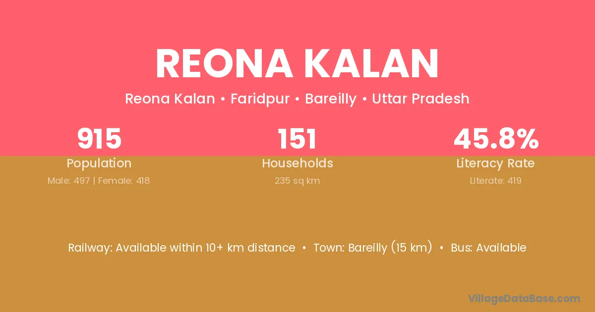 Bareilly (15 km) is the nearest town to Reona Kalan village for major economic activities and is located approximately 15 km away.