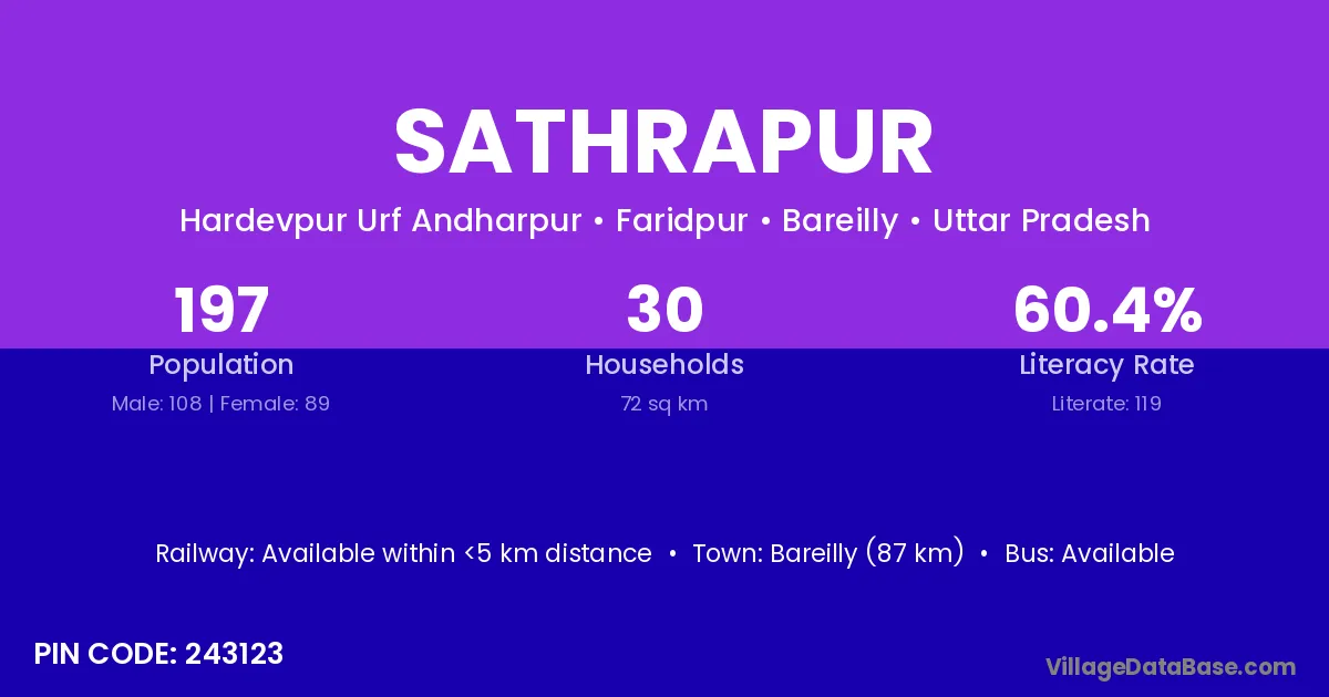 Bareilly (87 km) is the nearest town to Sathrapur village for major economic activities and is located approximately 87 km away.