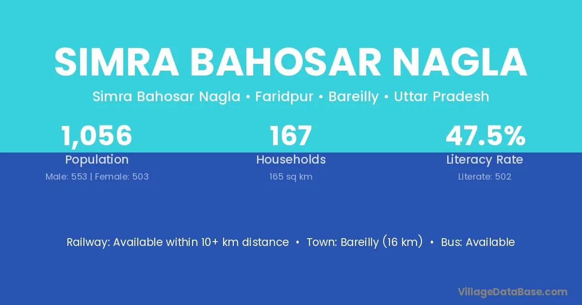 Bareilly (16 km) is the nearest town to Simra Bahosar Nagla village for major economic activities and is located approximately 16 km away.