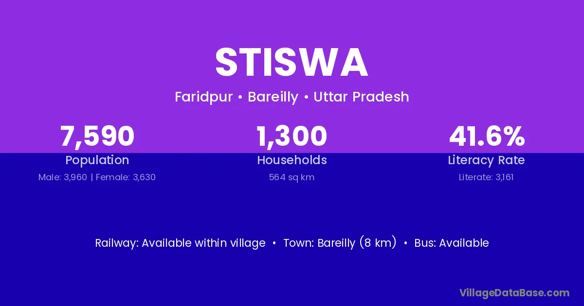 Bareilly (8 km) is the nearest town to Stiswa village for major economic activities and is located approximately 8 km away.