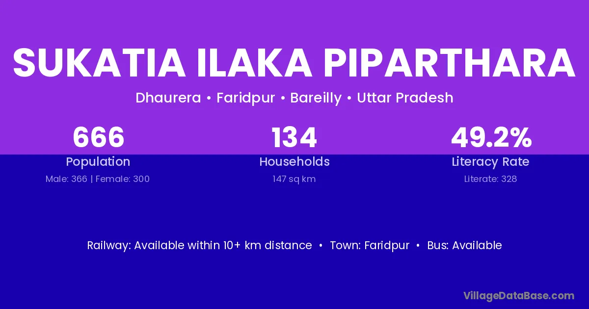 Sukatia Ilaka Piparthara village has a total population of 666 people, of which 366 are males and 300 are females.